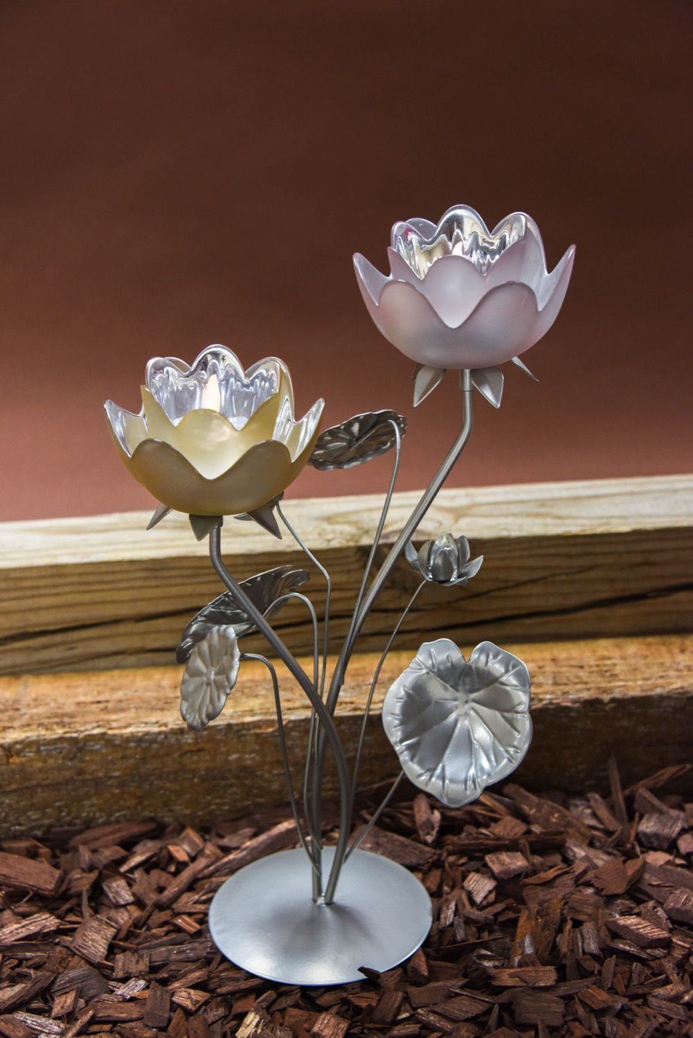 Centro de mesa de metal con 2 flores dobles de tulipán con cristal en el centro y una vela led en cada flor, en la parte baja 5 flores de metal.