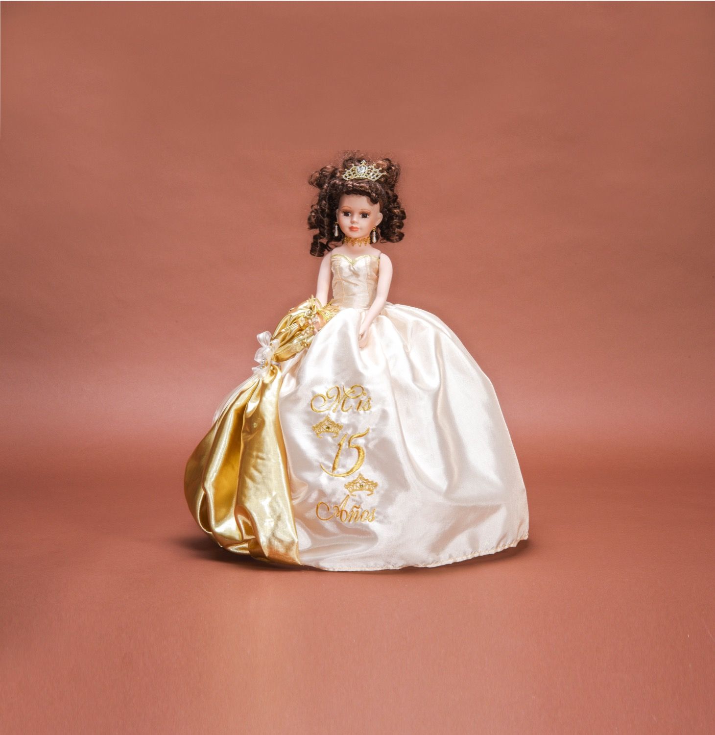 Muñeca hecha con vinilo con una altura de 24″. que en el peinado lleva una pequeña corona de cristales, así como aretes y un ramito en la mano derecha, el vestido es de tafeta y está bordado con las palabras Mis 15 Años y dos pequeñas coronas a los lados. del lado derecho tiene una cortina vertical hecha de tela metálica, unida al centro por un elegante broche de circonias en forma de coronita.